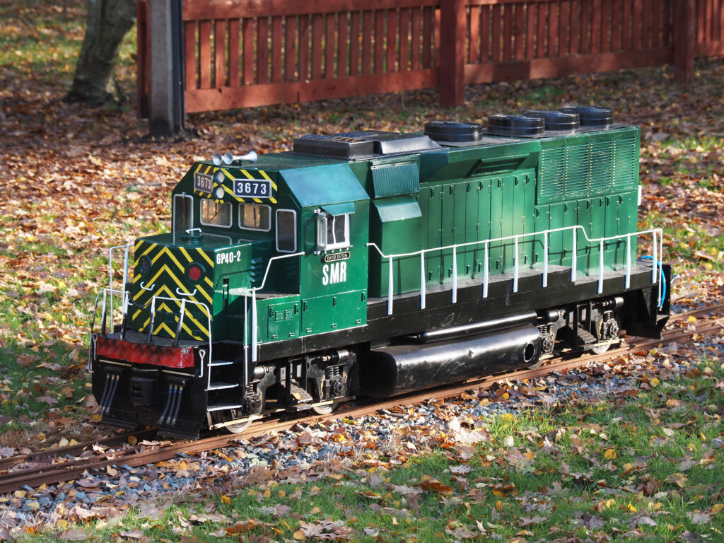 Probably our most regularly used locomotive, this 7.25″ gauge battery-electric model is based on a 4-axle diesel-electric GP40 locomotive, built by General Motors between November 1965 and December 1971. Previously in the livery of the New Haven Railroad, it has recently been refurbished and, internally, extensively rebuilt by a couple of volunteers (you know who you are…) to a very high standard, gaining its smart new livery at the same time. It is a powerful machine, easily capable of hauling a well loaded train around our circuit.